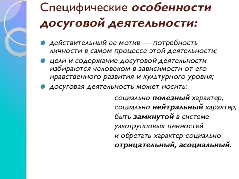 ► досуг удовлетворяет многие социально-психологические потребности в реализации интересов, самопроверке сил, самоутверждении среди сверстников, признании собственной личности;