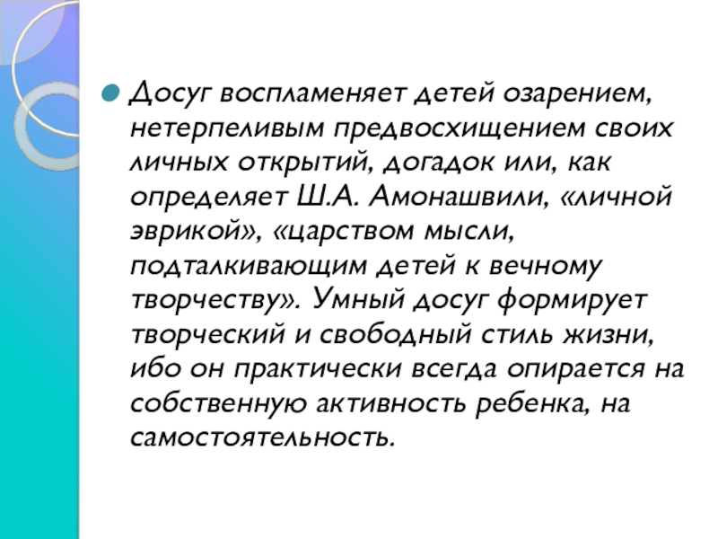 как определяет Ш.А. Амонашвили, «личной эврикой», «царством мысли, подталкивающим детей к вечному творчеству». Умный досуг формирует творческий и свободный стиль жизни, ибо он практически всегда опирается на собственную активность ребенка, на самостоятельность.