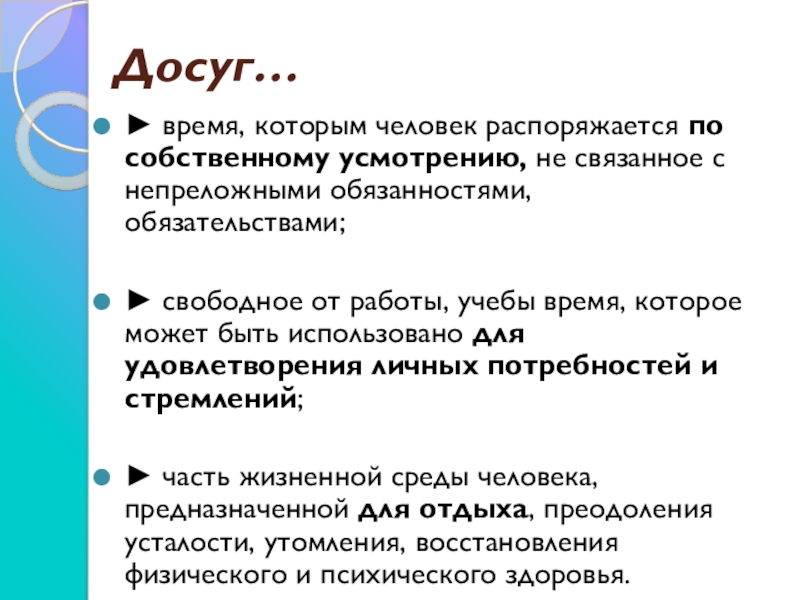 ► свободное от работы, учебы время, которое может быть использовано для удовлетворения личных потребностей и стремлений;
