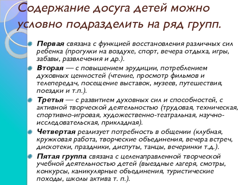 Слайд 11Содержание досуга детей можно условно подразделить на ряд групп.