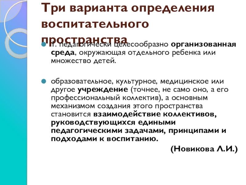 образовательное, культурное, медицинское или другое учреждение (точнее, не само оно, а его профессиональный коллектив), а основным механизмом создания этого пространства становится взаимодействие коллективов, руководствующихся едиными педагогическими задачами, принципами и подходами к воспитанию.