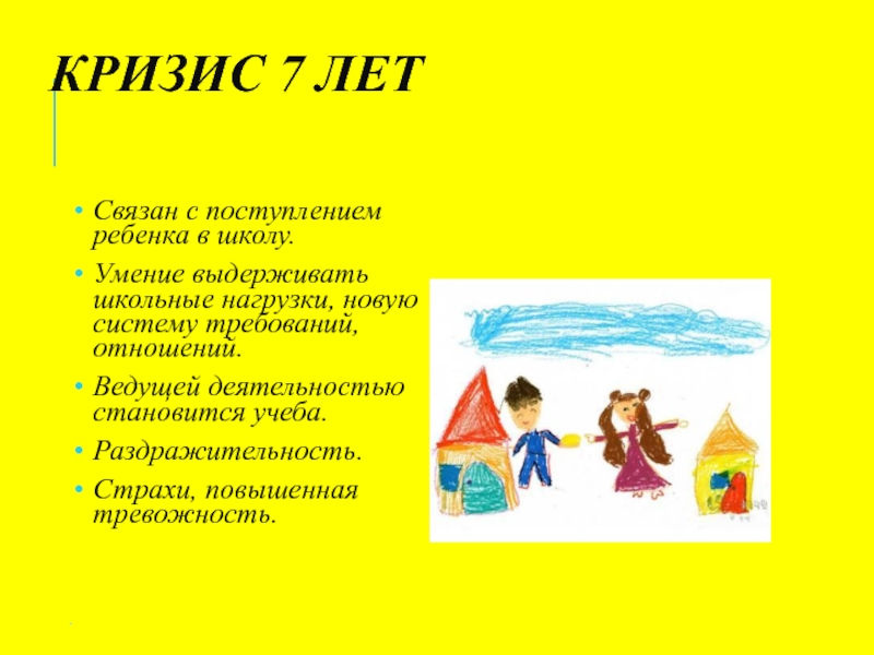 КРИЗИС 7 ЛЕТ Связан с поступлением ребенка в школу. Умение выдерживать школьные нагрузки, новую систему требований, отношений.Ведущей