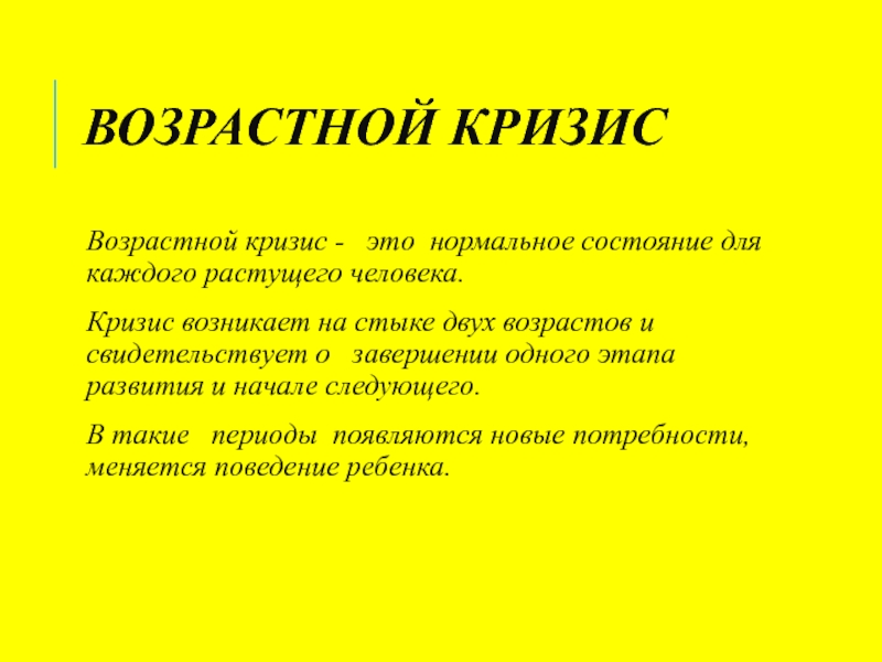 ВОЗРАСТНОЙ КРИЗИСВозрастной кризис -  это нормальное состояние для каждого растущего человека. Кризис возникает на стыке двух