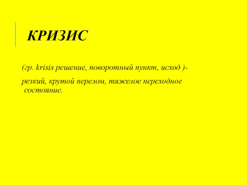 КРИЗИС(гр. krisis решение, поворотный пункт, исход )-резкий, крутой перелом, тяжелое переходное состояние.