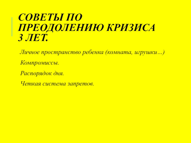 СОВЕТЫ ПО ПРЕОДОЛЕНИЮ КРИЗИСА  3 ЛЕТ. Личное пространство ребенка (комната, игрушки…) Компромиссы. Распорядок дня. Четкая система