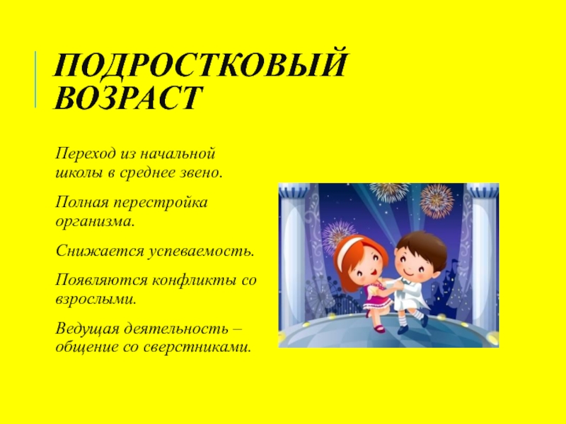 ПОДРОСТКОВЫЙ ВОЗРАСТПереход из начальной школы в среднее звено.Полная перестройка организма.Снижается успеваемость.Появляются конфликты со взрослыми.Ведущая деятельность – общение