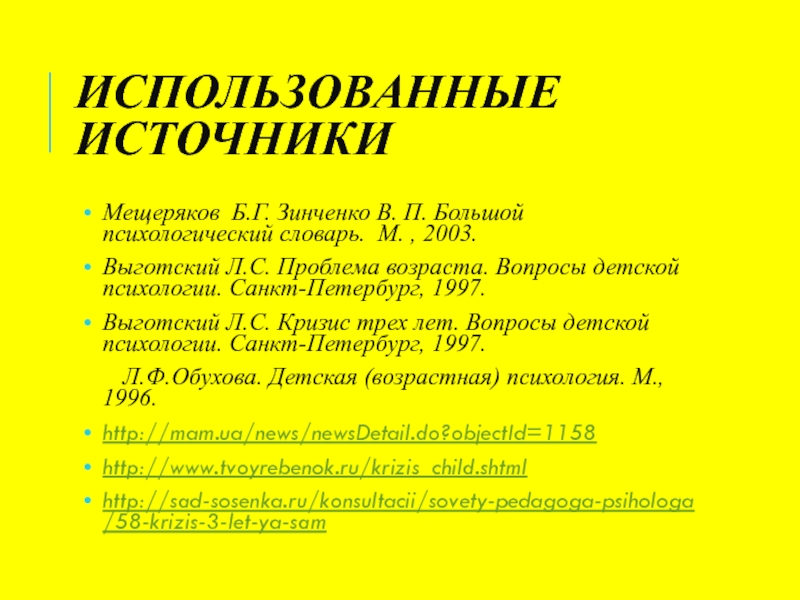 ИСПОЛЬЗОВАННЫЕ ИСТОЧНИКИМещеряков Б.Г. Зинченко В. П. Большой психологический словарь. М. , 2003.Выготский Л.С. Проблема возраста. Вопросы детской