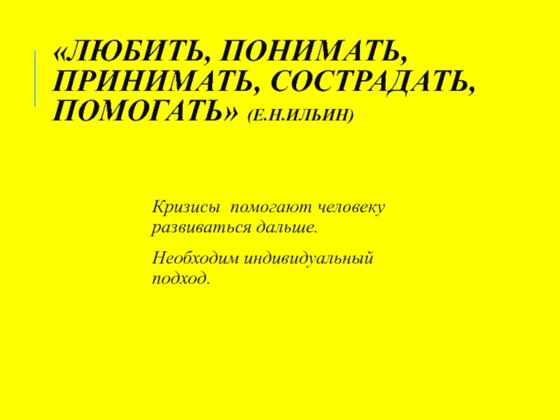«ЛЮБИТЬ, ПОНИМАТЬ, ПРИНИМАТЬ, СОСТРАДАТЬ, ПОМОГАТЬ» (Е.Н.ИЛЬИН)Кризисы помогают человеку развиваться дальше.Необходим индивидуальный подход.