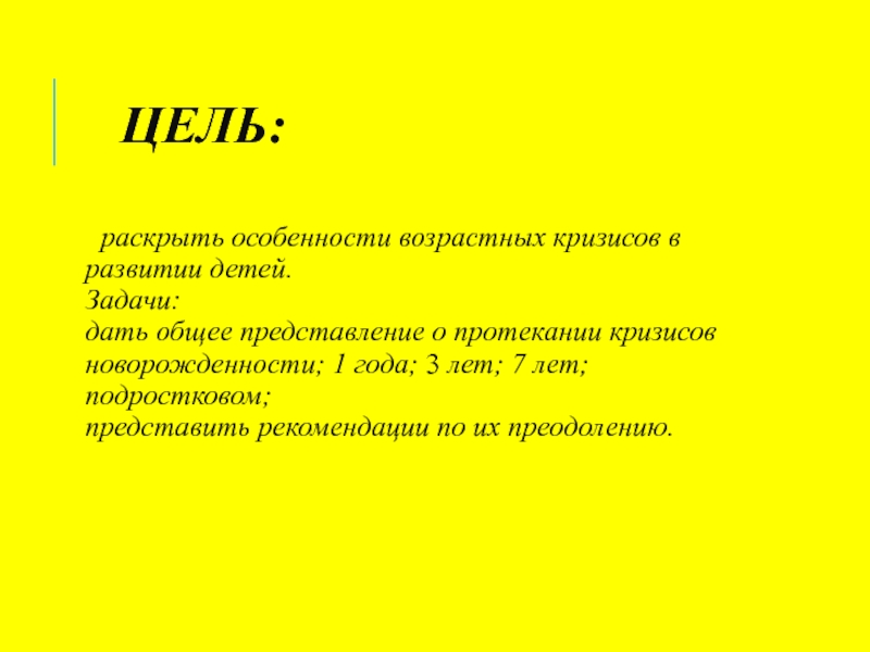 ЦЕЛЬ:  раскрыть особенности возрастных кризисов в развитии детей. Задачи:  дать общее представление о