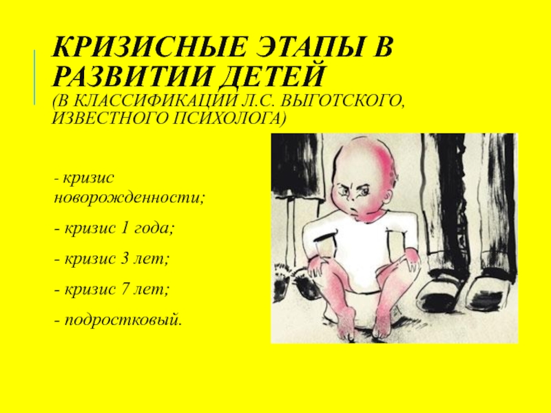 КРИЗИСНЫЕ ЭТАПЫ В РАЗВИТИИ ДЕТЕЙ (В КЛАССИФИКАЦИИ Л.С. ВЫГОТСКОГО, ИЗВЕСТНОГО ПСИХОЛОГА)   - кризис новорожденности;- кризис