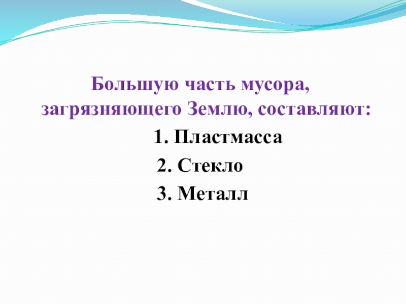 Большую часть мусора, загрязняющего Землю, составляют:    1. Пластмасса2. Стекло 3. Металл