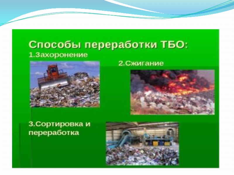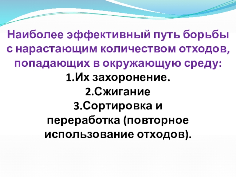 Наиболее эффективный путь борьбы с нарастающим количеством отходов, попадающих в окружающую среду:1.Их захоронение.2.Сжигание3.Сортировка и переработка (повторное использование отходов).