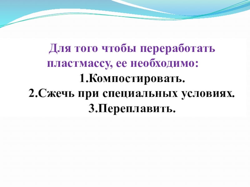Слайд 16Для того чтобы переработать пластмассу, ее необходимо: