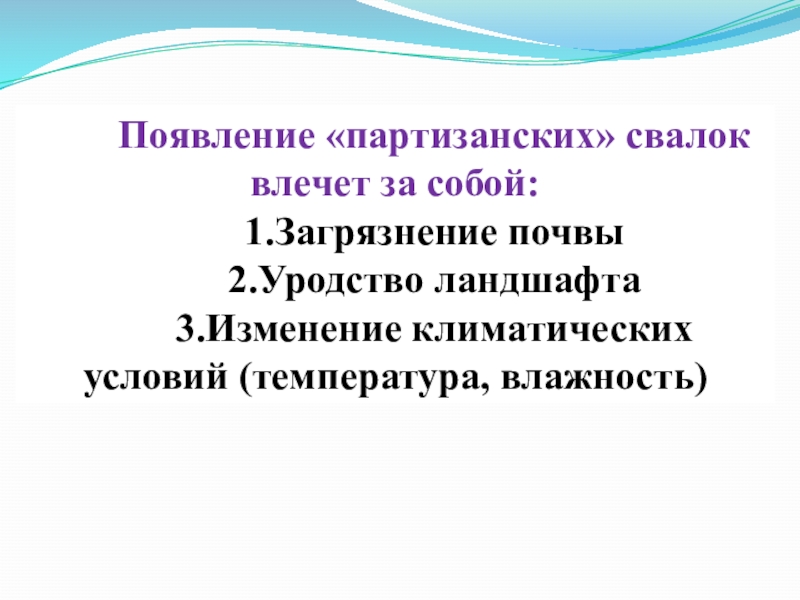 Появление «партизанских» свалок влечет за собой:1.Загрязнение почвы 2.Уродство ландшафта3.Изменение климатических условий (температура, влажность)
