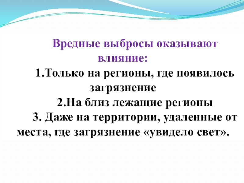 Вредные выбросы оказывают влияние:1.Только на регионы, где появилось загрязнение2.На близ лежащие регионы3. Даже на территории, удаленные от