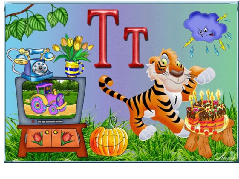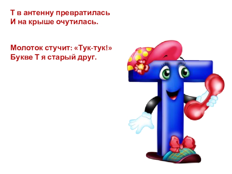 Т в антенну превратилась И на крыше очутилась. Молоток стучит: «Тук-тук!»Букве Т я старый друг.