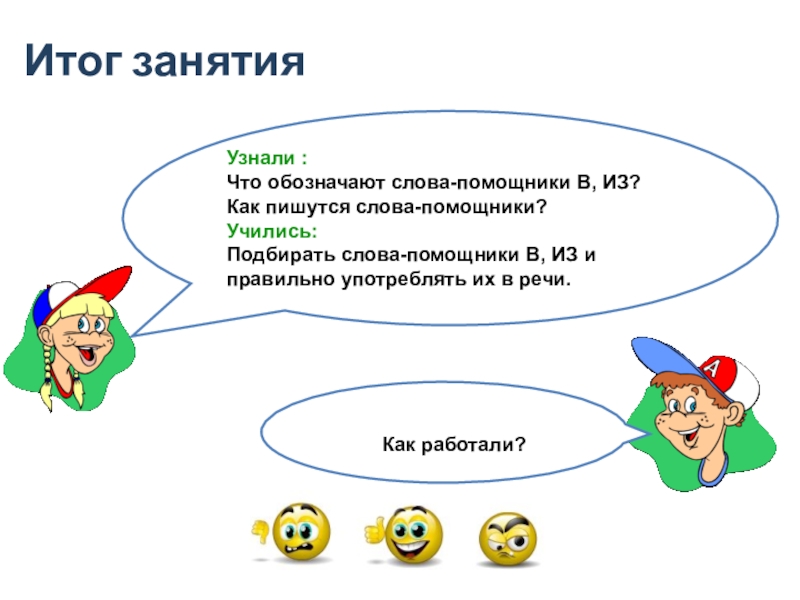 Узнали :Что обозначают слова-помощники В, ИЗ?Как пишутся слова-помощники?Учились:Подбирать слова-помощники В, ИЗ и правильно употреблять их в речи.Итог