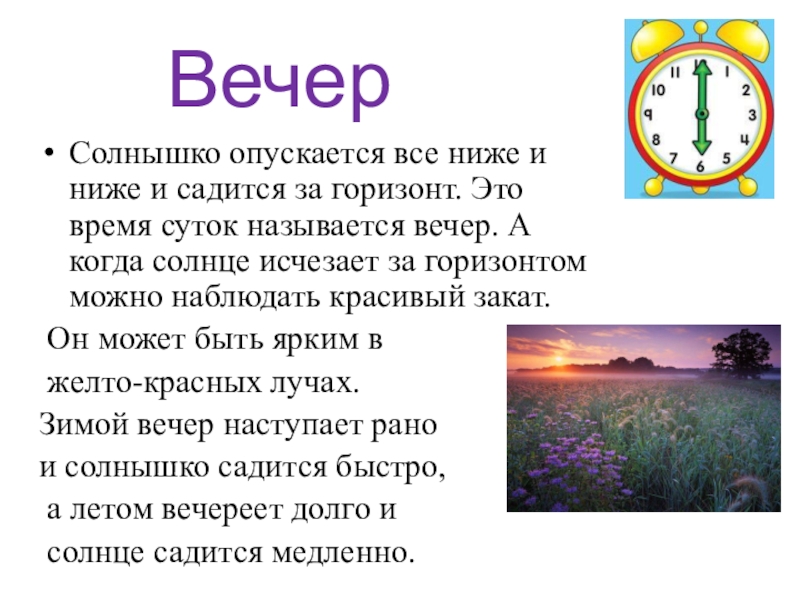 Это время суток называется вечер. А когда солнце исчезает за горизонтом можно наблюдать красивый закат.