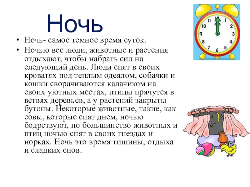 отдыхают, чтобы набрать сил на следующий день. Люди спят в своих кроватях под теплым одеялом, собачки и кошки сворачиваются калачиком на своих уютных местах, птицы прячутся в ветвях деревьев, а у растений закрыты бутоны. Некоторые животные, такие, как совы, которые спят днем, ночью бодрствуют, но большинство животных и птиц ночью спят в своих гнездах и норках. Ночь это время тишины, отдыха и сладких снов.