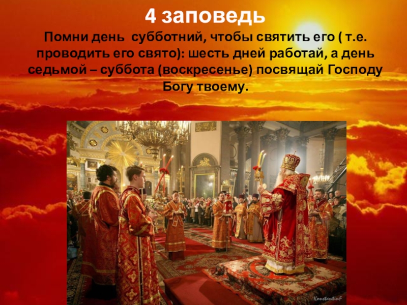 4 заповедь Помни день субботний, чтобы святить его ( т.е. проводить его свято): шесть дней работай, а
