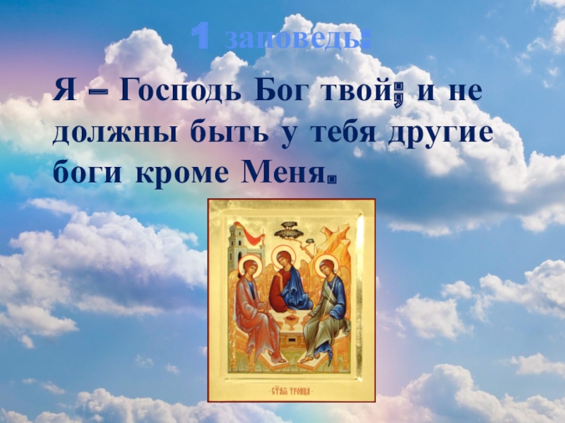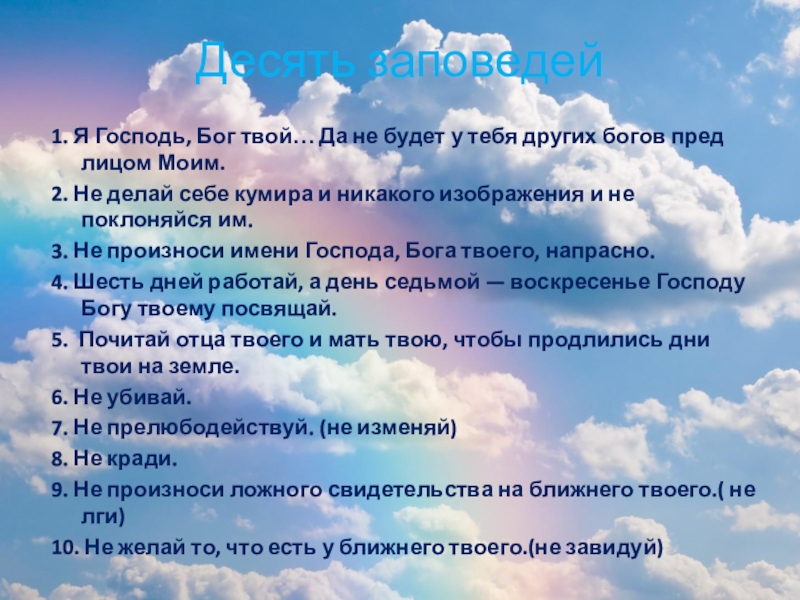 Десять заповедей1. Я Господь, Бог твой… Да не будет у тебя других богов пред лицом Моим.2. Не делай себе