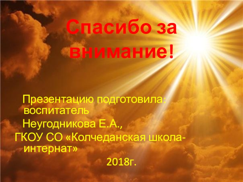 Спасибо за внимание!   Презентацию подготовила: воспитатель  Неугодникова Е.А., ГКОУ СО «Колчеданская школа-интернат» 2018г.