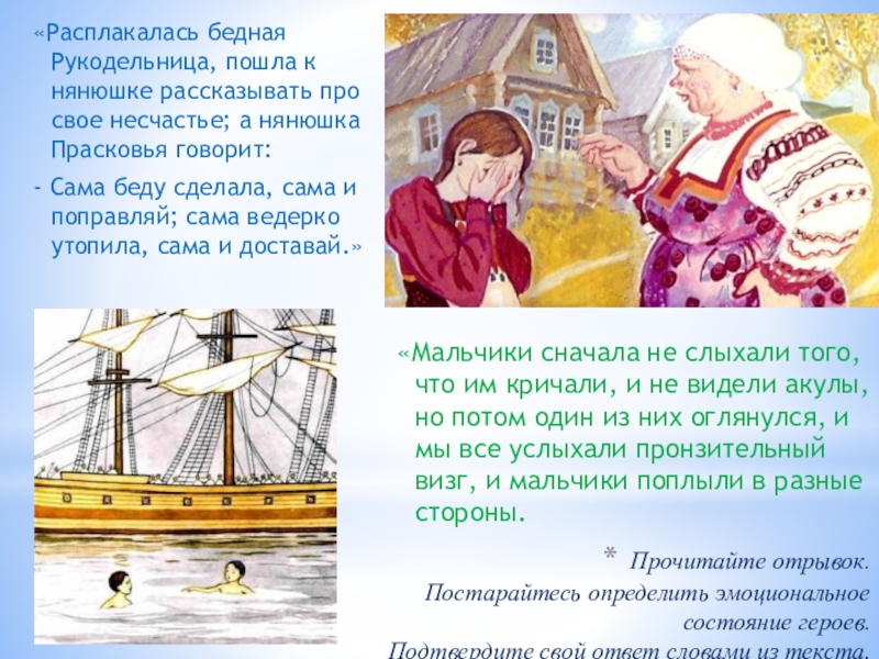 «Мальчики сначала не слыхали того, что им кричали, и не видели акулы, но потом один из них оглянулся, и мы все услыхали пронзительный визг, и мальчики поплыли в разные стороны.