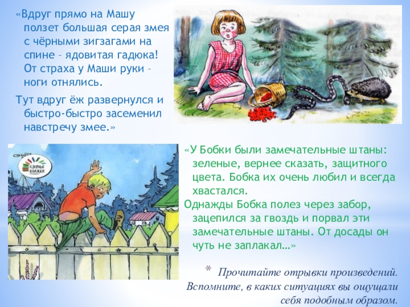 Однажды Бобка полез через забор, зацепился за гвоздь и порвал эти замечательные штаны. От досады он чуть не заплакал…»