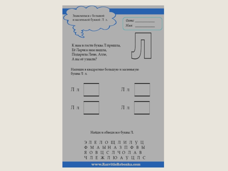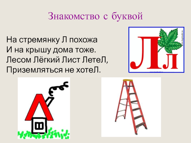 Знакомство с буквойНа стремянку Л похожаИ на крышу дома тоже.Лесом Лёгкий Лист ЛетеЛ,Приземляться не хотеЛ.