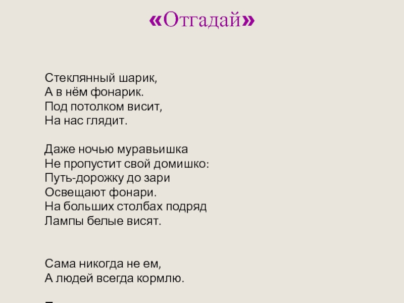 «Отгадай» Стеклянный шарик,А в нём фонарик.Под потолком висит,На нас глядит.Даже ночью муравьишкаНе пропустит свой домишко:Путь-дорожку до зариОсвещают фонари.На больших столбах подрядЛампы белые висят. Сама никогда не ем,А людей всегда кормлю.Прежде чем его мы съели,Мы наплакаться успели.