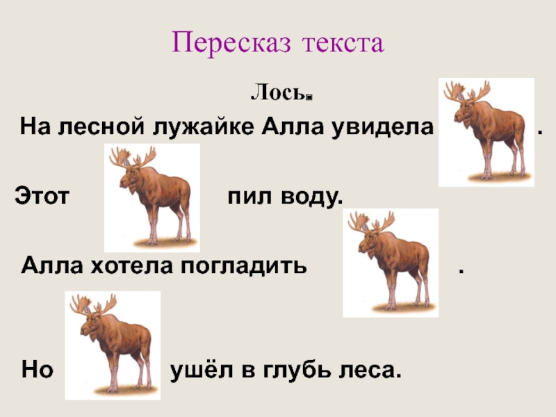 Пересказ текстаЛось. На лесной лужайке Алла увидела        .