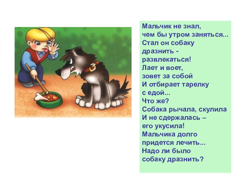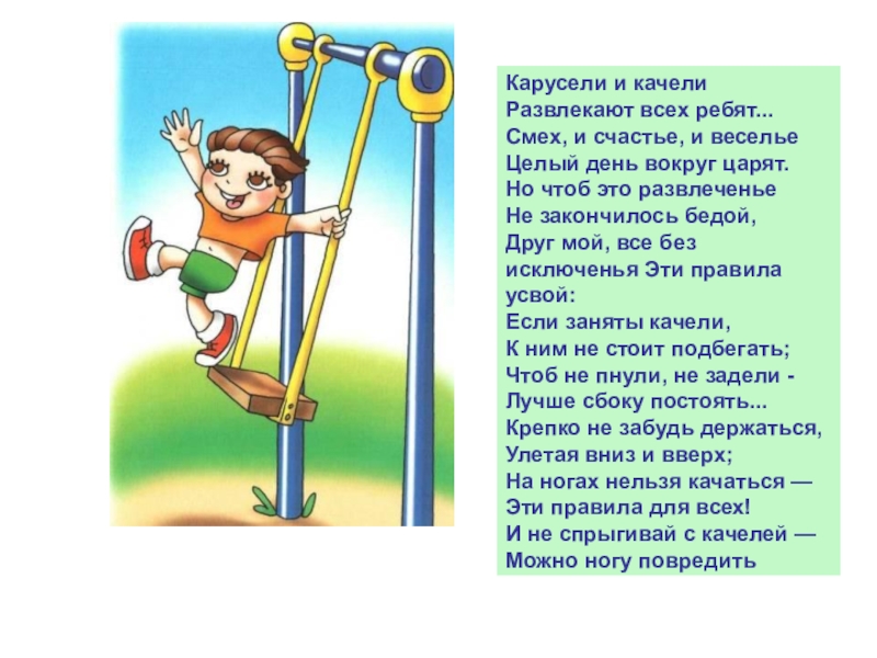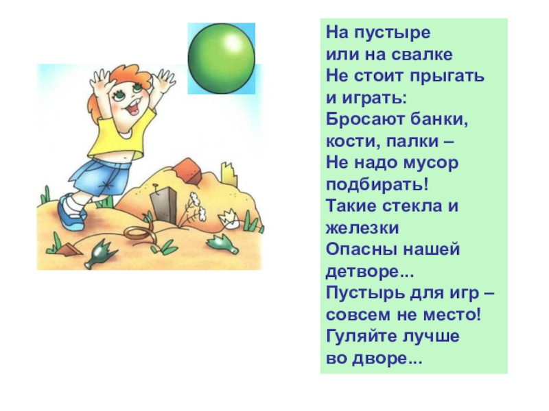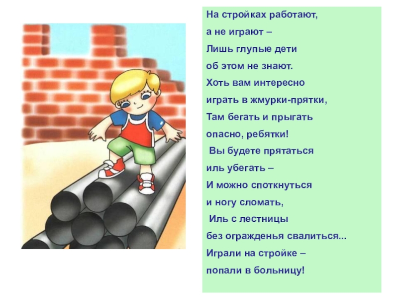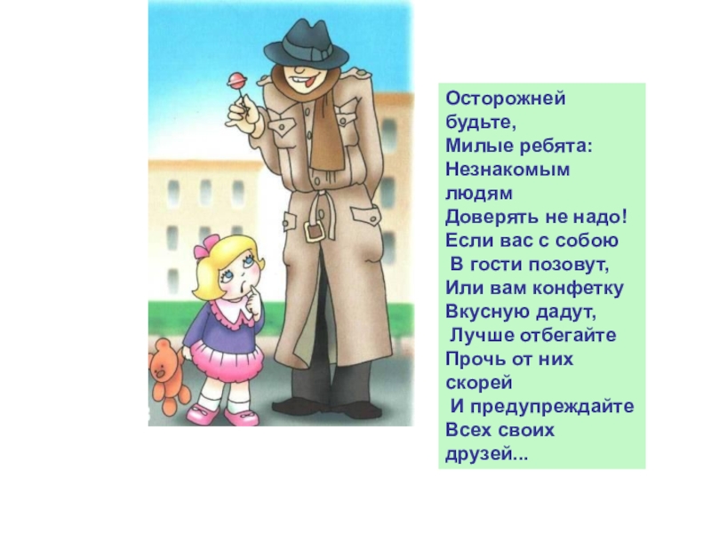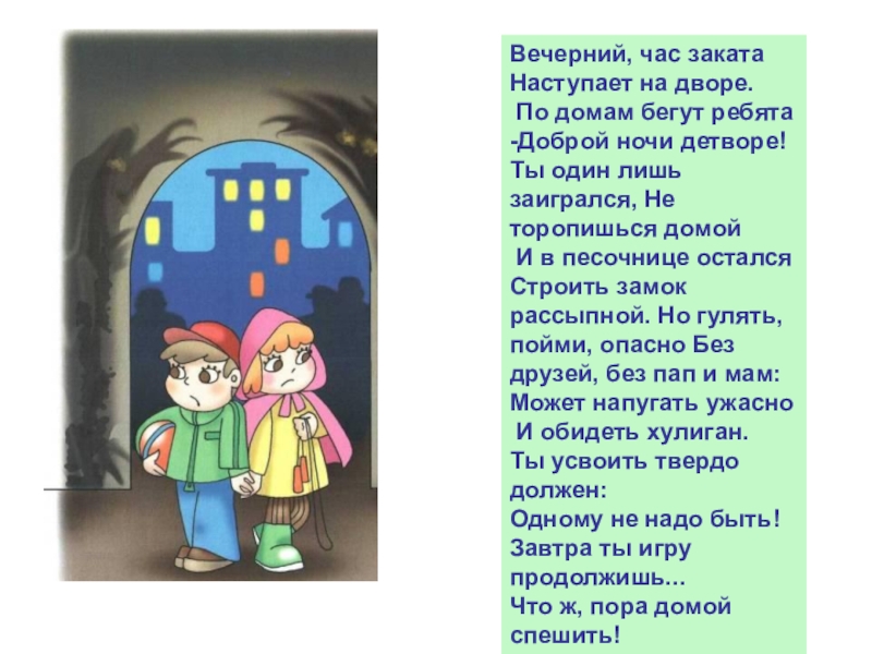 И в песочнице остался Строить замок рассыпной. Но гулять, пойми, опасно Без друзей, без пап и мам: Может напугать ужасно