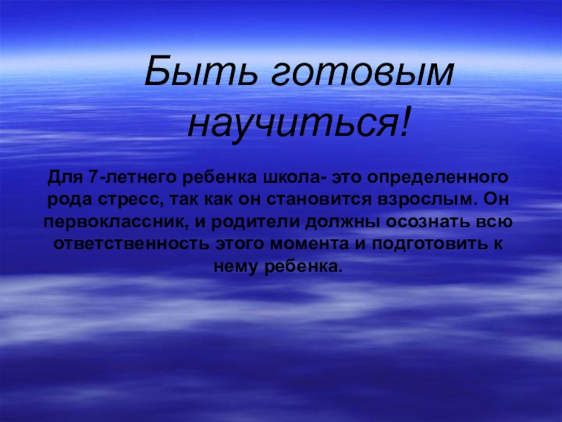 Быть готовым научиться! Для 7-летнего ребенка школа- это определенного рода стресс, так как он становится взрослым. Он первоклассник, и родители должны осознать всю ответственность этого момента и подготовить к нему ребенка.