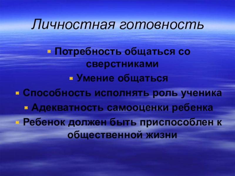 Личностная готовностьПотребность общаться со сверстниками Умение общатьсяСпособность исполнять роль ученикаАдекватность самооценки ребенкаРебенок должен быть приспособлен к общественной