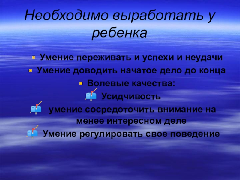 Необходимо выработать у ребенкаУмение переживать и успехи и неудачиУмение доводить начатое дело до концаВолевые качества:Усидчивость умение сосредоточить