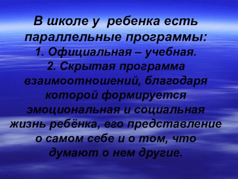В школе у ребенка есть параллельные программы: 1. Официальная – учебная. 2. Скрытая программа взаимоотношений, благодаря которой