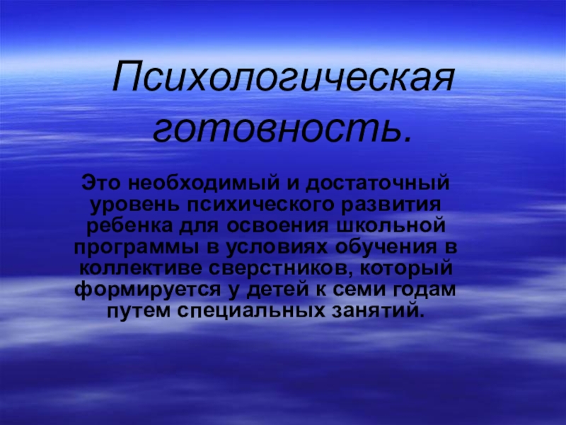 Психологическая готовность.Это необходимый и достаточный уровень психического развития ребенка для освоения школьной программы в условиях обучения в
