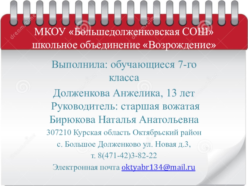 МКОУ «Большедолженковская СОШ» школьное объединение «Возрождение»Выполнила: обучающиеся 7-го классаДолженкова Анжелика, 13 лет  Руководитель: старшая вожатая Бирюкова