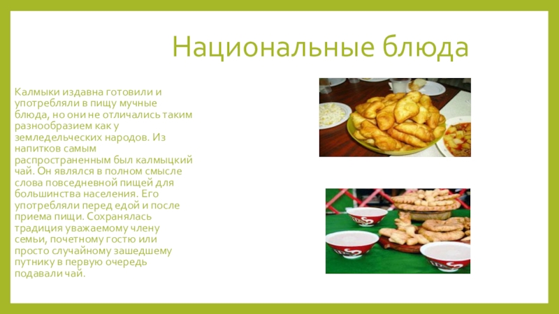 Национальные блюдаКалмыки издавна готовили и употребляли в пищу мучные блюда, но они не отличались таким разнообразием