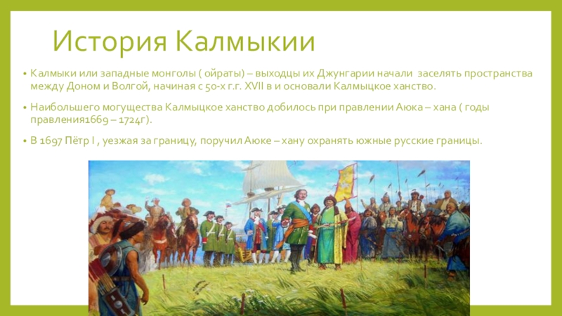 В 1697 Пётр I , уезжая за границу, поручил Аюке – хану охранять южные русские границы.