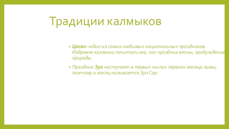 Традиции калмыковЦаган –один из самых любимых национальных праздников. Издревле калмыки почитали его, как праздник весны,