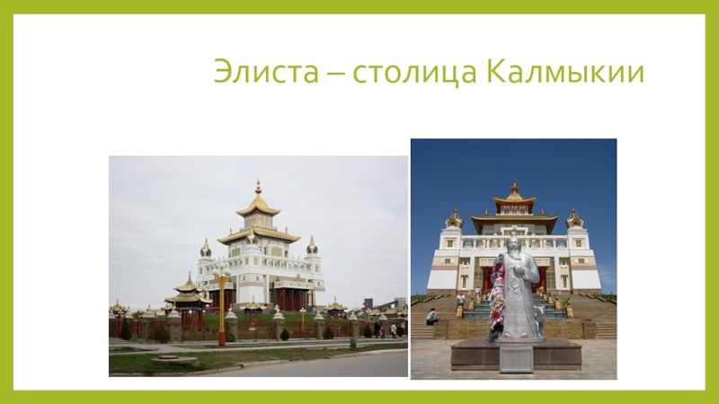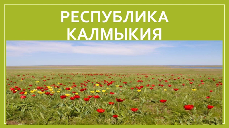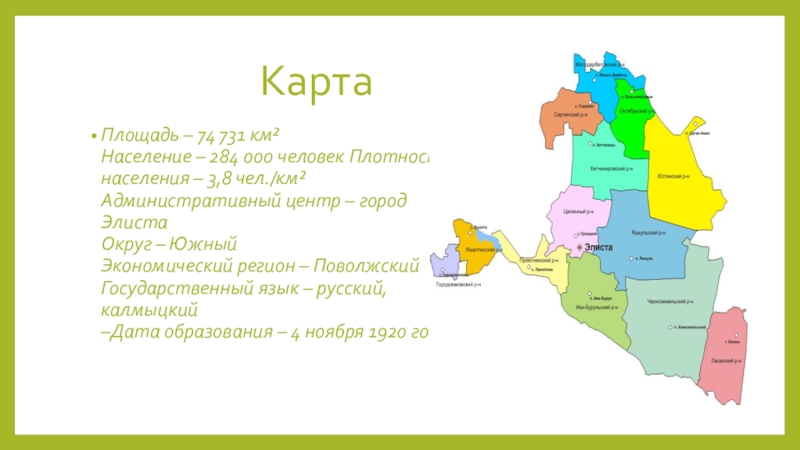 КартаПлощадь – 74 731 км² Население – 284 000 человек Плотность населения – 3,8 чел./км² Административный центр – город Элиста Округ – Южный Экономический регион – Поволжский Государственный язык – русский, калмыцкий –Дата