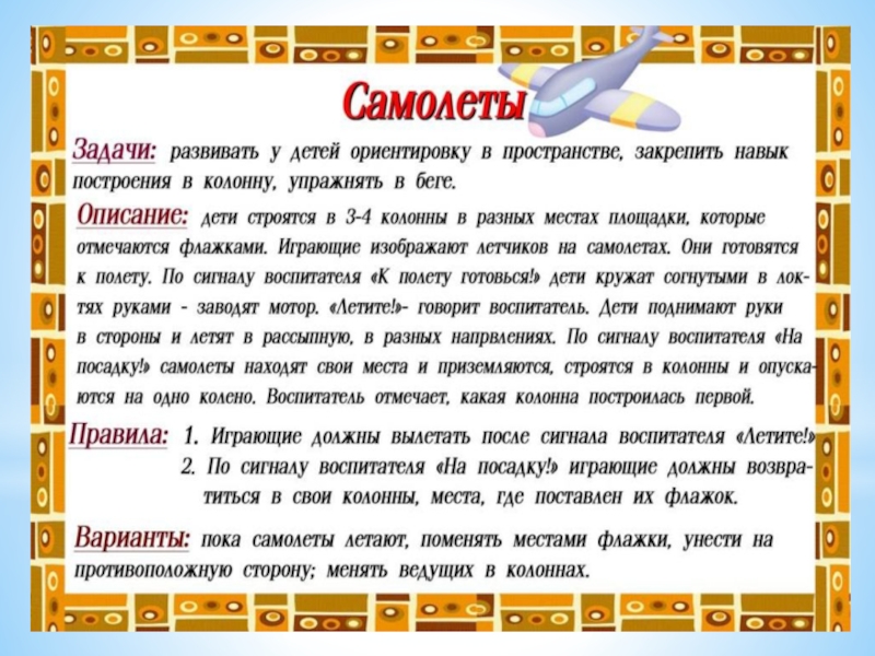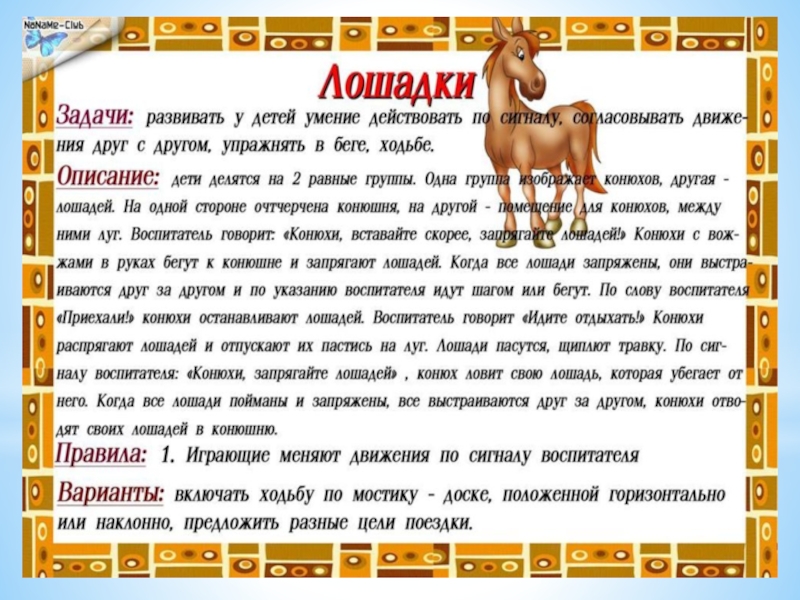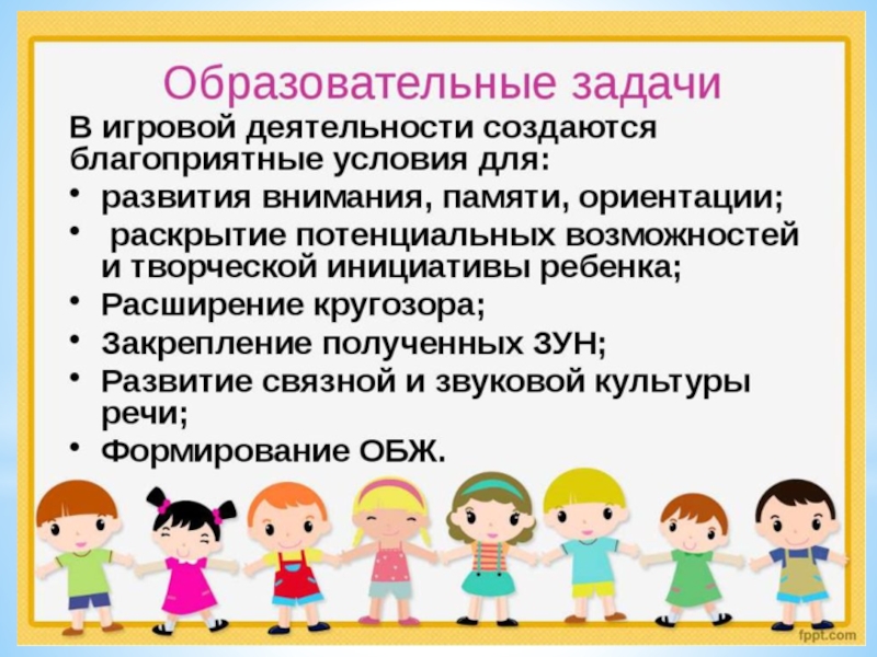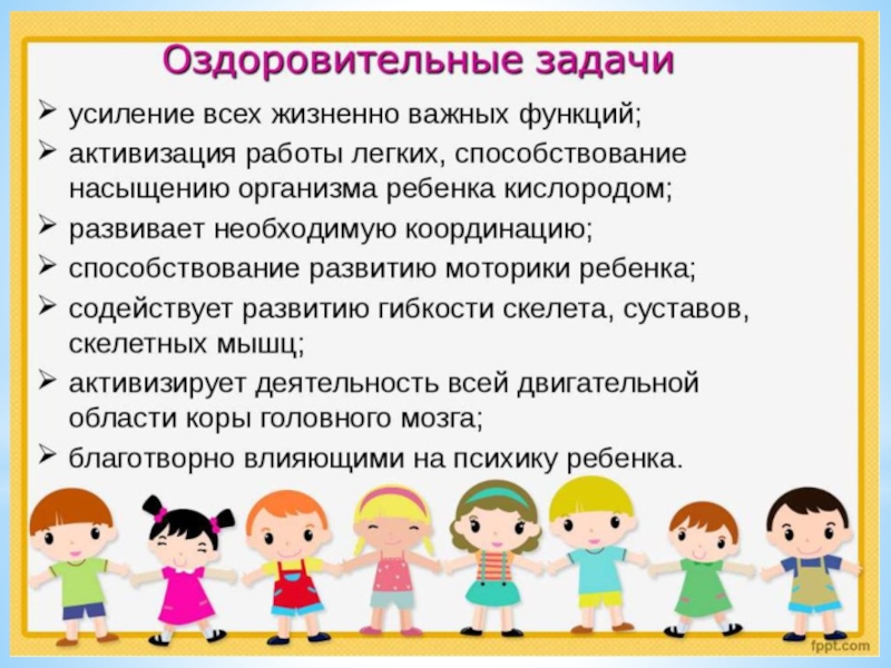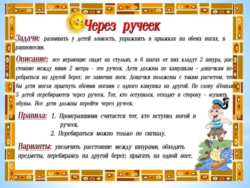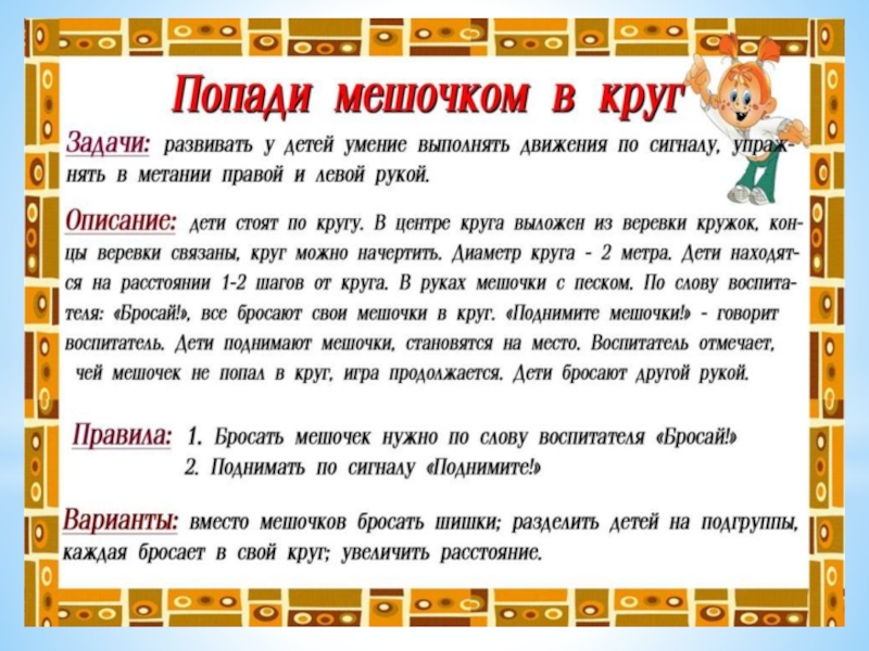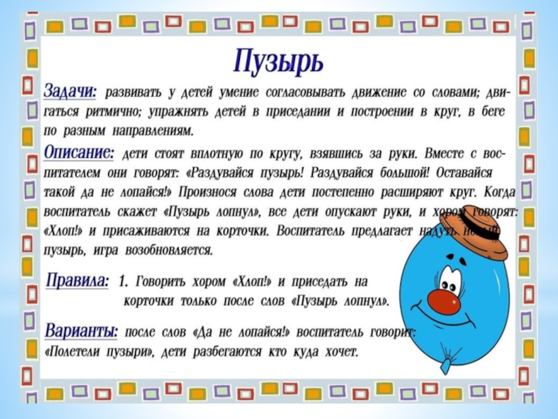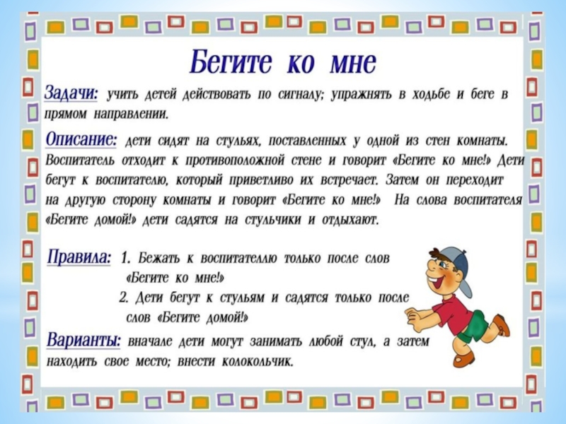 задач, основанная на движении и наличии правил. Игра активизирует дыхание, кровообращение и обменные процессы, совершенствует движения, развивает их координацию, формирует быстроту, силу, выносливость, учит детей действовать в соответствии с правилами, осознанно действовать в изменяющийся игровой ситуации, познавать окружающий мир, активизирует память, представления, развивает мышление, воображение, пополняет словарный запас и обогащает речь детей, учит действовать в коллективе, подчиняться общим требованиям, формирует честность, справедливость, дисциплинированность, учит дружить, сопереживать, помогать друг другу, развивает чувство ритма, способствует овладению пространственной терминологии.