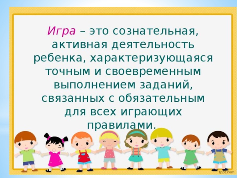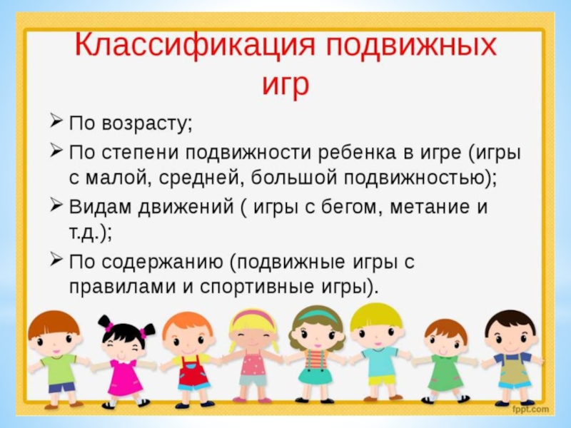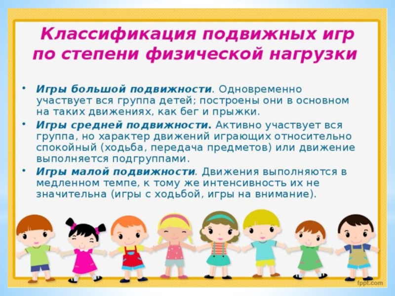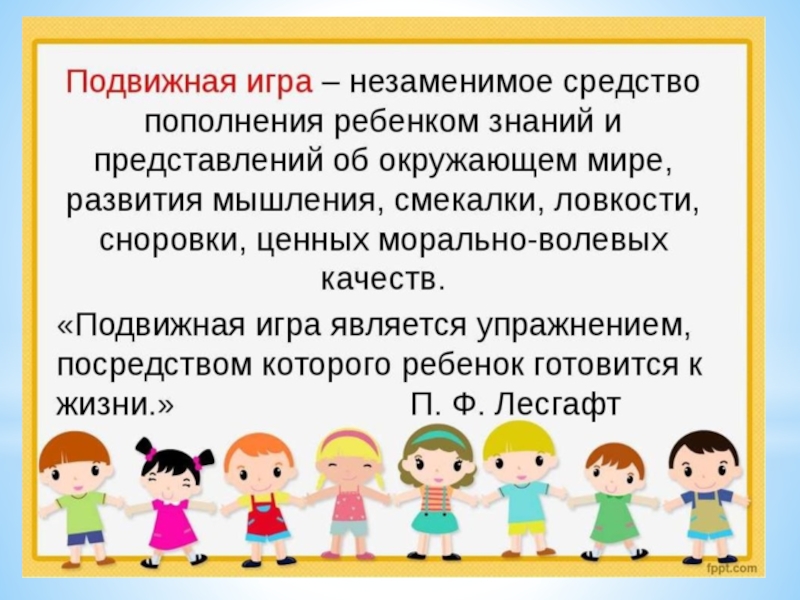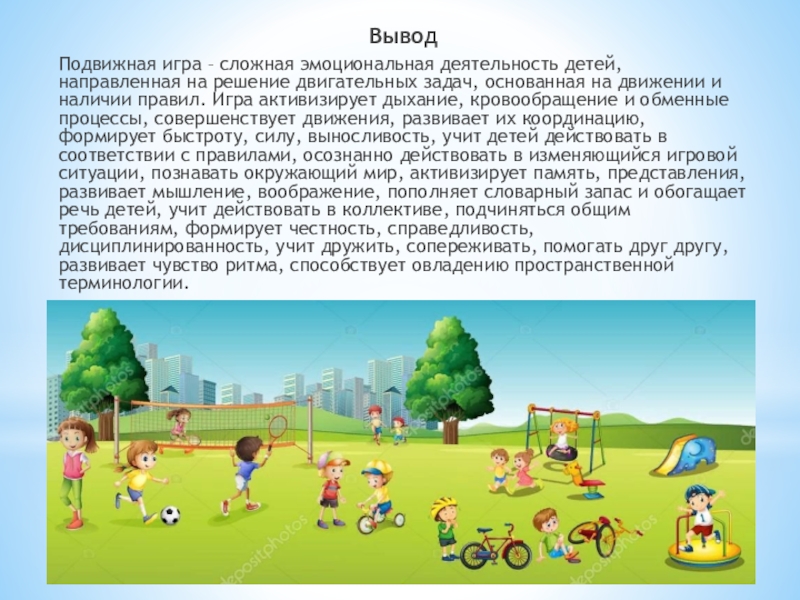 ВыводПодвижная игра – сложная эмоциональная деятельность детей, направленная на решение двигательных задач, основанная на движении и наличии