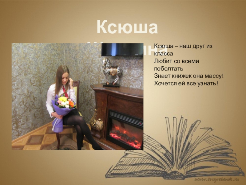 Ксюша ШкадинаКсюша – наш друг из класса Любит со всеми поболтать Знает книжек она массу! Хочется ей