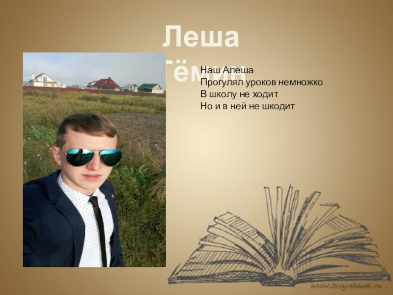 Леша ТёминНаш Алеша Прогулял уроков немножко В школу не ходит Но и в ней не шкодит