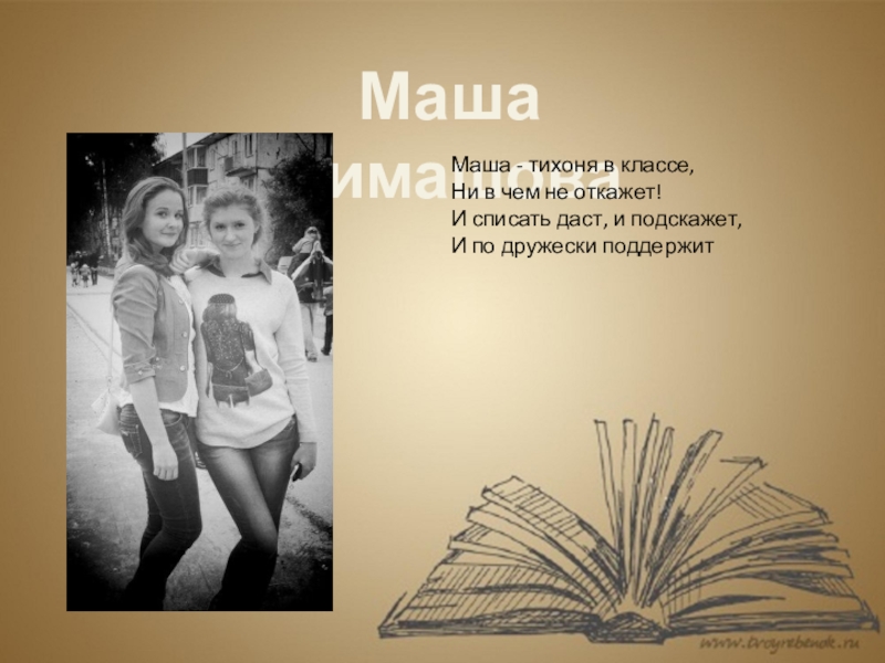 Маша СимашоваМаша - тихоня в классе,  Ни в чем не откажет! И списать даст, и подскажет,