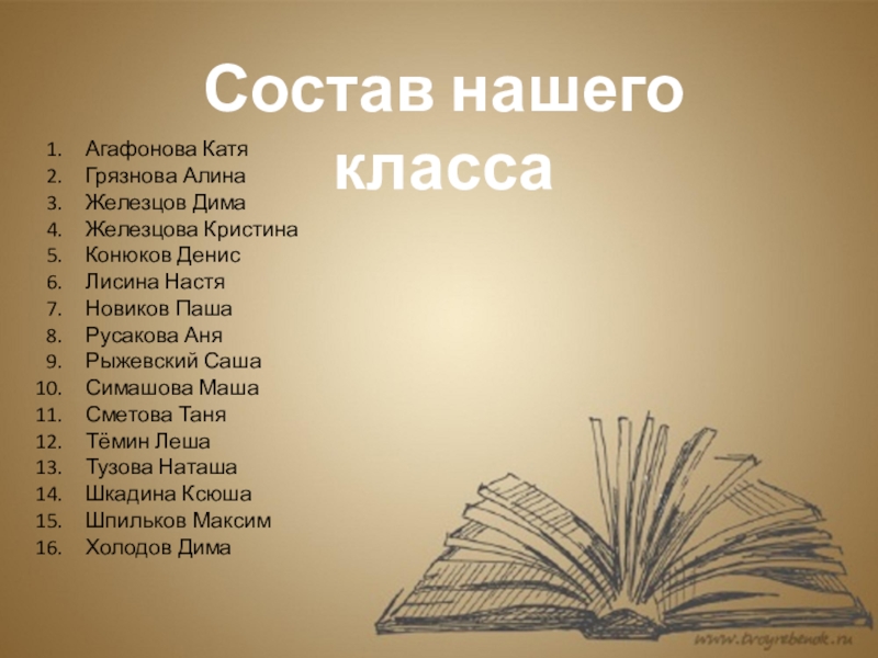 Состав нашего классаАгафонова КатяГрязнова АлинаЖелезцов ДимаЖелезцова КристинаКонюков ДенисЛисина НастяНовиков ПашаРусакова АняРыжевский СашаСимашова МашаСметова ТаняТёмин ЛешаТузова НаташаШкадина КсюшаШпильков
