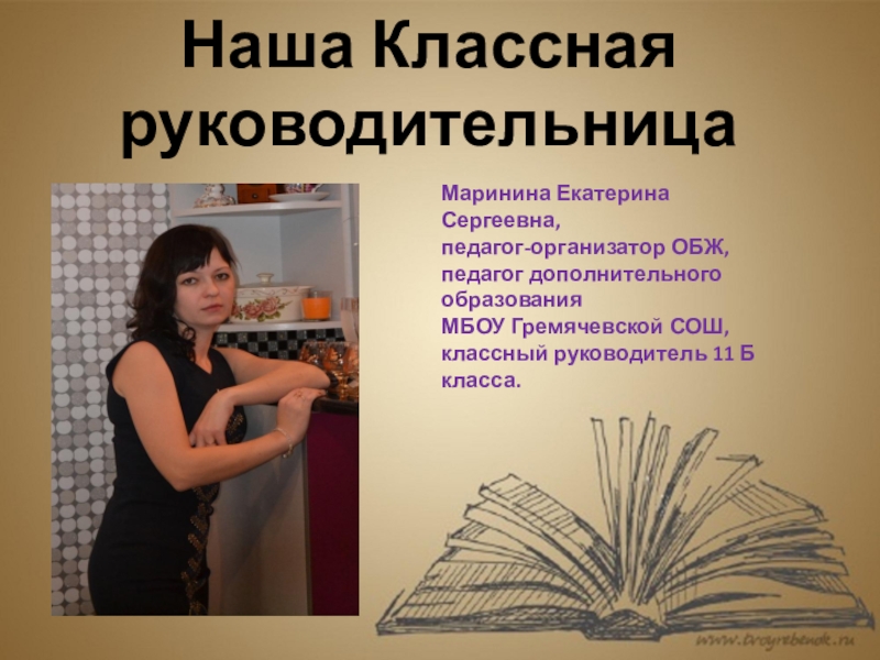 Наша Классная руководительницаМаринина Екатерина Сергеевна, педагог-организатор ОБЖ, педагог дополнительного образования МБОУ Гремячевской СОШ, классный руководитель 11 Б