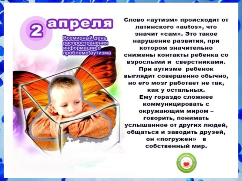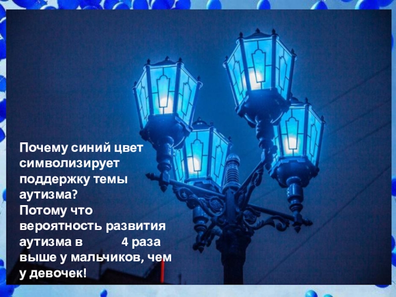 Слайд 11Почему синий цвет символизирует поддержку темы аутизма?